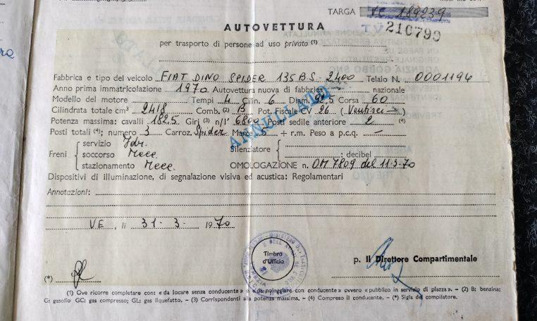 This car’s history is exceptional with its aristocratic links with also being this rare colour, being first registered in Treviso in March 1970. It was delivered new to Prince Egon Sebastian von Fürstenberg, noted fashion stylist and nephew of Fiat chairman Gianni Agnelli. Subsequent owners included a Treviso surgeon, a school friend of Agnelli, Prince Tassilo Von Furstenberg from Veneto. Where this famous family still have a castle in Veneto near Venice.